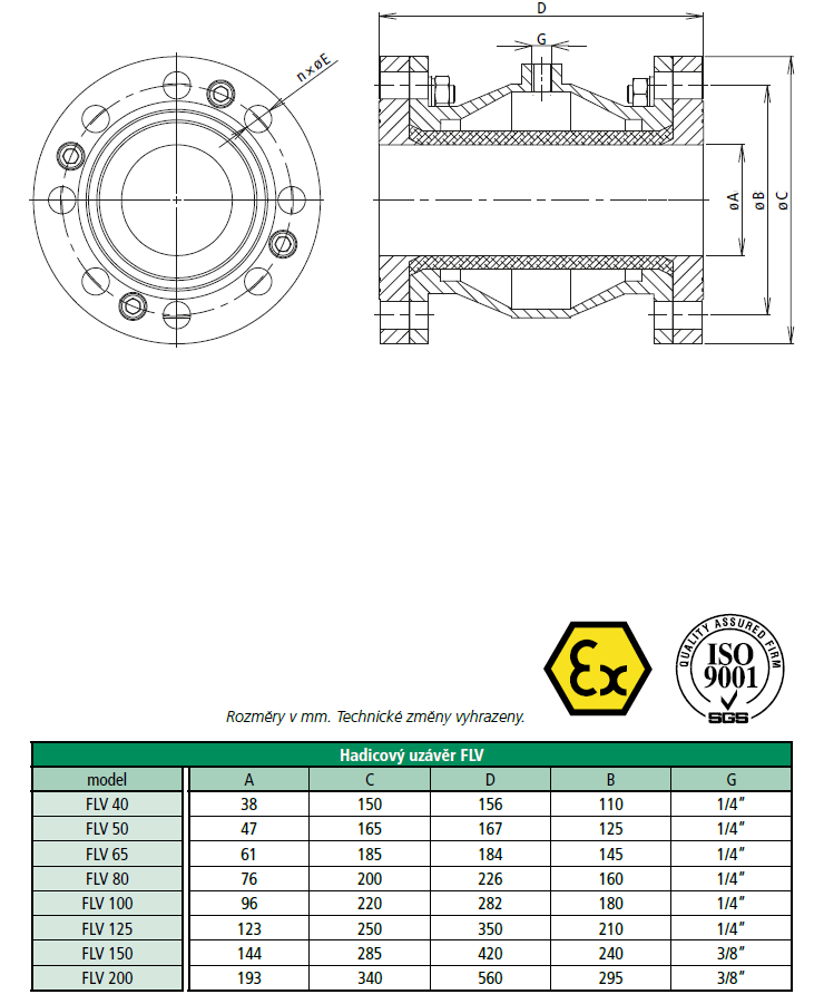 Hadicové uzávěry dostupné v provedení tělesa a přírub z hliníku tj. typ FLVA, nebo v provedení tělesa z hliníku a přírub z litiny tj. typ FLVG popř. v provedení z tělesa z hliníku a přírub z nerezové oceli.